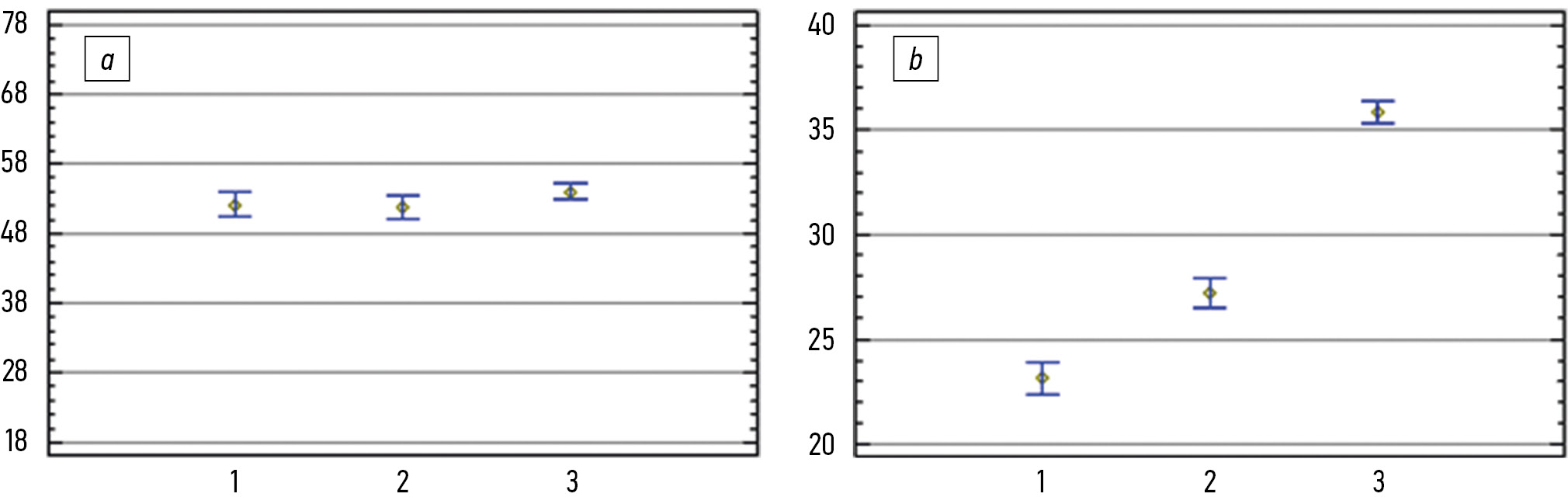 Рис. 2. Средние значения возраста (a) и индекса массы тела (b) и их 95 % доверительные интервалы в трех группах