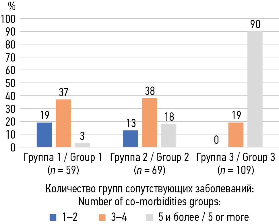 Рис. 3. Распределение пациентов по количеству групп сопутствующих заболеваний (Cumulative Illness Rating Scale). Уровни значимости различий: p₁₋₂ = 0,0041; p₂₋₃ < 0,0001; p₁₋₃ < 0,0001