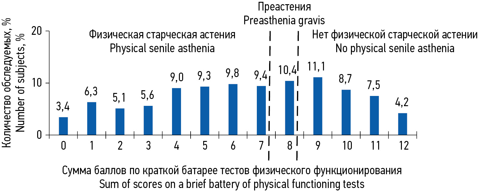Все материалы исследования, включая анкеты, инструкции и протоколы, представлены на русском языке, что обеспечивало максимальное понимание и вовлеченность со стороны всех участников. Для оценки физического статуса и верификации ФСА использована КБТФФ. По ее результатам все пациенты разделены на три подгруппы: итог 7 баллов и менее свидетельствовал о ФСА, при результате 8–9 баллов пациентов относили к группе преастении, и ФСА отсутствовала у лиц, набравших 10–12 баллов.