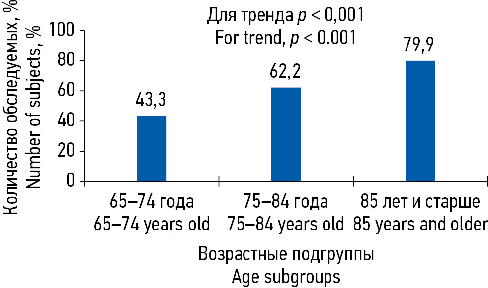 Рис. 2. Распространенность физической старческой астении у амбулаторных пациентов в возрасте 65 лет и старше в зависимости от возрастной подгруппы (n = 2553)