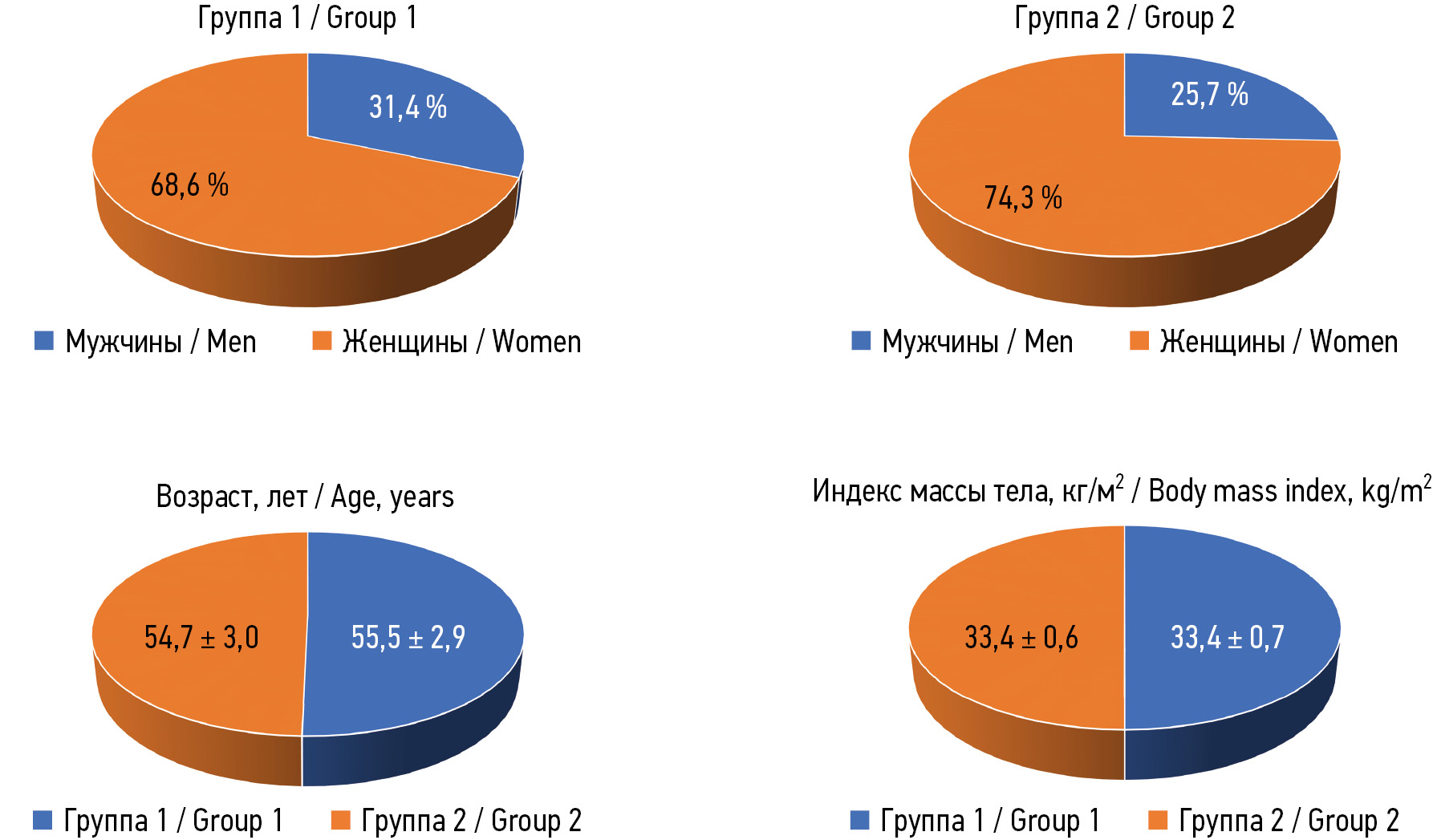 Характеристика исследуемой выборки: пациенты были сопоставимы по полу (χ2 = 0,1162; p = 0,5926), возрасту (t = −0,0939; p = 0,9255) и индексу массы тела (t = 0,1162; p = 0,9063) (рис. 1).