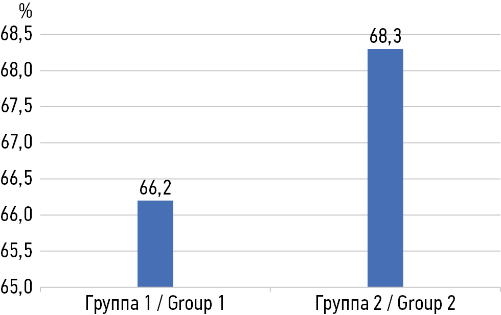 В исследуемых группах преобладали пациенты со среднетяжелой и тяжелой БА, объем форсированного выдоха за 1 с составил 66,2 % в группе 1 и 68,3 % в группе 2 (p = 0,5470) (рис. 2). Контролируемой БА не было, показатели ACQ-5 в обеих группах достоверно не отличались (табл. 1).