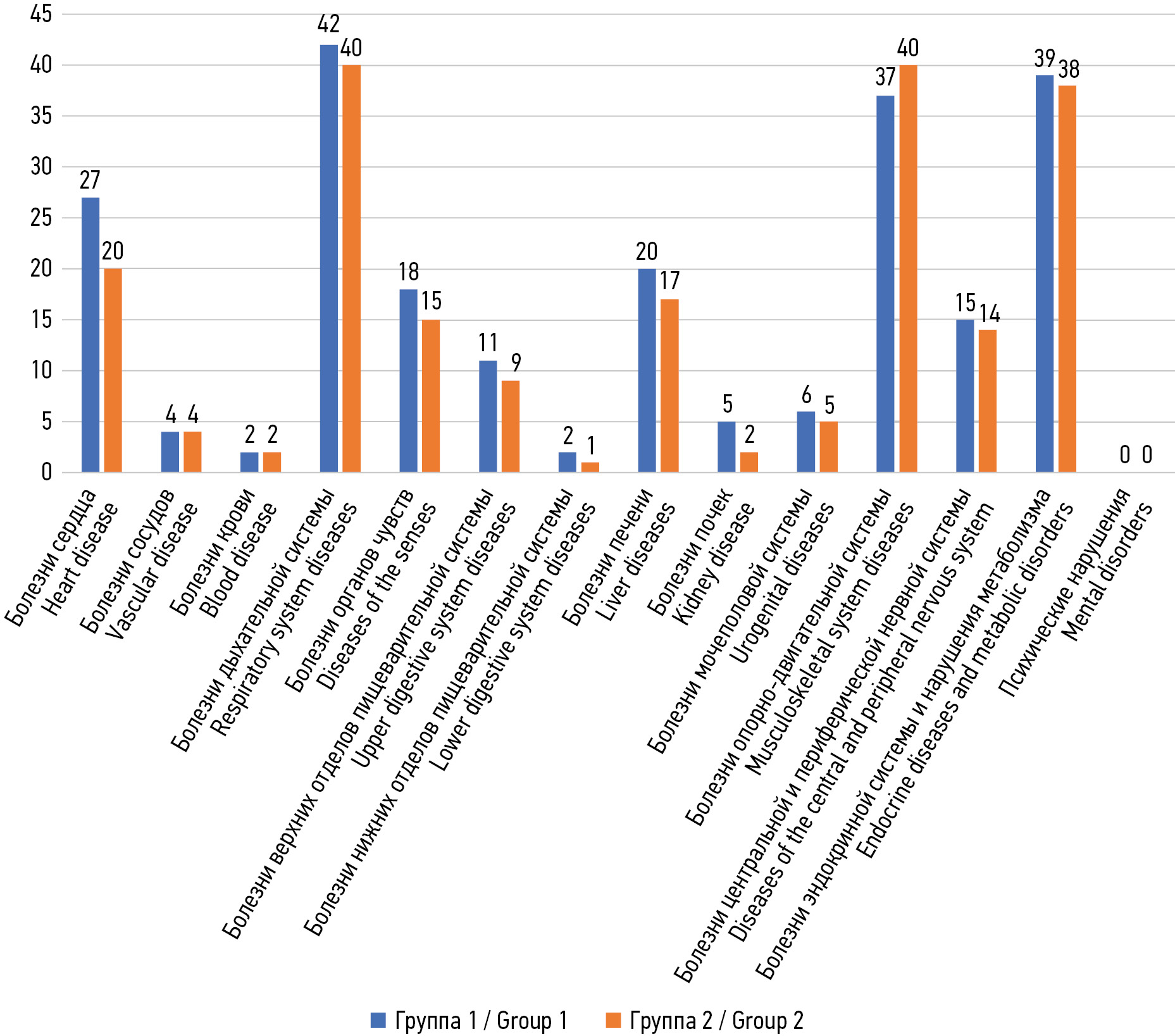 На основании CIRS, в которой сопутствующие заболевания разделены по системам, оценили распространенность заболеваний в группах (рис. 3).