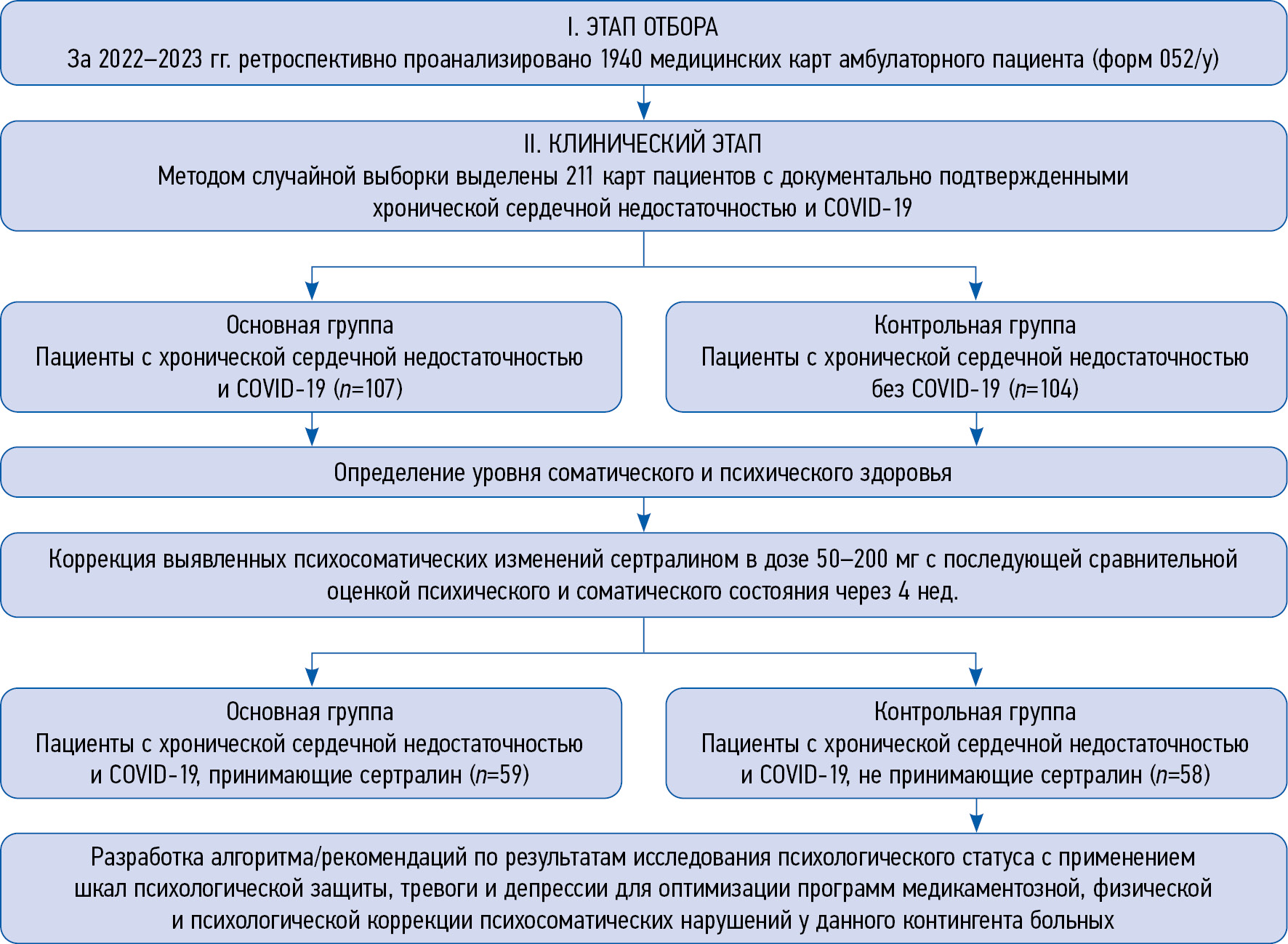 Пациенты с ХСН и COVID-19 после психометрического обследования были разделены на две группы. Основной группе назначили антидепрессант из группы селективных ингибиторов обратного захвата серотонина в дозе 25–100 мг 1 раз в сутки. Препарат назначали врачи общей практики, прошедшие обучение по «Программе действий Всемирной организации здравоохранения по ликвидации пробелов в области охраны психического здоровья» (mhGAP).