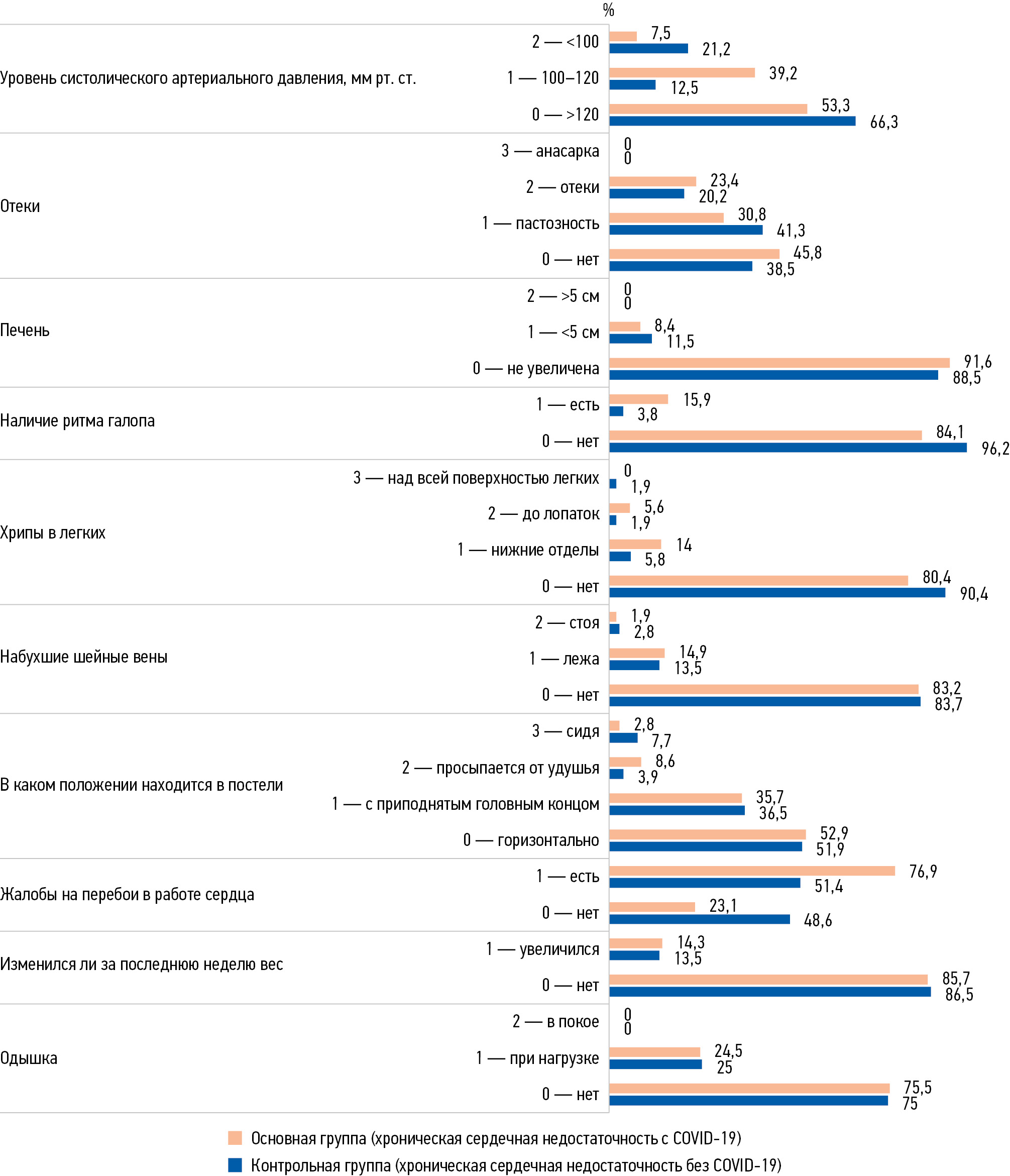 Сравнительный анализ данных оценки соматического состояния показал (рис. 2) одышку при физической нагрузке у 25% пациентов контрольной группы и примерно у такого же количества пациентов в основной группе (24,5%). Увеличение массы тела за последнюю неделю наблюдали только у 13,5% пациентов из группы ХСН без COVID-19 и у 14,3% пациентов из группы ХСН с COVID-19. Это означает, что в исследовании участвовали стабильные пациенты. Перебои в работе сердца отмечены у 76,9% пациентов основной группы и у 51,4% — контрольной группы. 36,5% пациентов контрольной группы и 35,7% основной группы отметили, что спят с приподнятым головным концом, 3,9% пациентов без COVID-19 и 8,6% лиц с COVID-19 просыпаются от удушья, а 7,7 и 2,8% пациентов соответственно указали, что спят сидя. Застойные явления по малому кругу кровообращения (хрипы в легких) наблюдали у 9,6% пациентов без COVID-19 и у 19,6% лиц с COVID-19. Нарушения по большому кругу кровообращения (увеличение печени) выявлены у 11,5% пациентов контрольной группы и 8,4% больных основной группы, отеки различной степени (кроме анасарки) выявлены почти у каждого второго пациента обеих групп. Таким образом, группы были сопоставимы по клиническому состоянию пациентов, несмотря на небольшие различия некоторых показателей.
