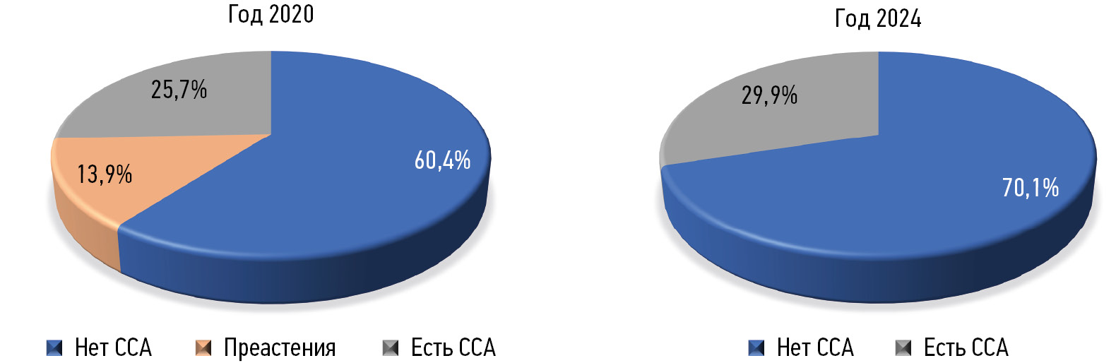 Рис. 1. Сравнительная частота синдрома старческой астении (ССА) по клиническим рекомендациям 2020 и 2024 гг.