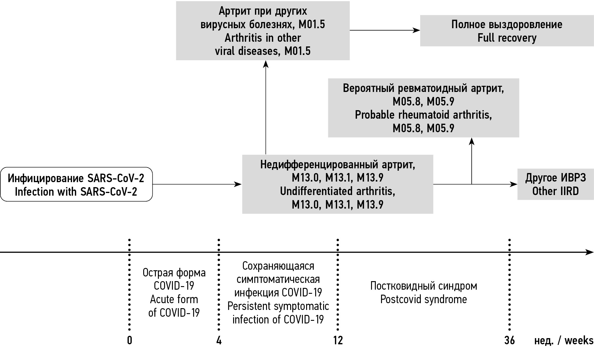 Рис. 1. Схема эволюции суставного синдрома после COVID-19 (собственные данные). ИВРЗ — иммуновоспалительных ревматических заболеваний