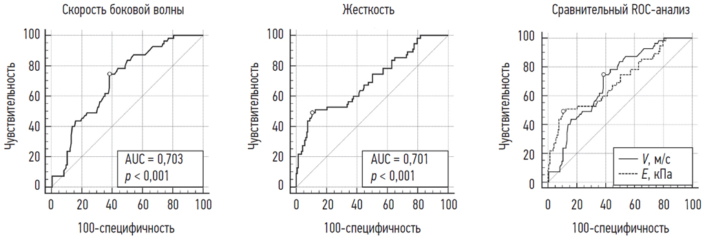 Fig. 3. Diagrams of the ROC analysis of SWE data separately and comparative analysis of ROC curves. The dots indicate the optimal values of the cutoff thresholds by the Youden index