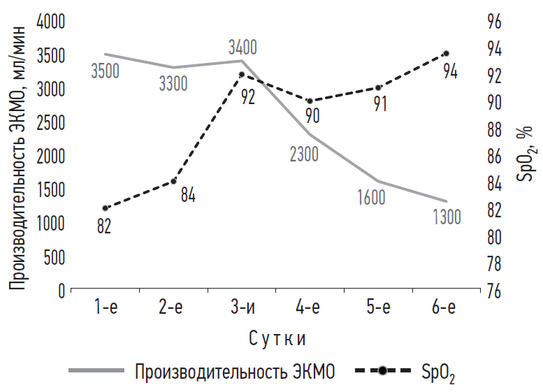 На 3-и сут на фоне улучшения состояния больного началось поэтапное снижение производительности ЭКМО, на 6-е сут экстракорпоральная поддержка прекращена (см. рисунок).