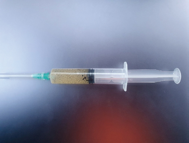 В качестве исследуемого материала выступало местное биоразлагаемое гемостатическое средство, которое представляет собой однородную, бледно-желтую непрозрачную гелеобразную субстанцию без запаха на основе хитозана. Перед проведением эксперимента необходимое количество геля помещалось в стерильный шприц объемом 5 мл (рис. 1).