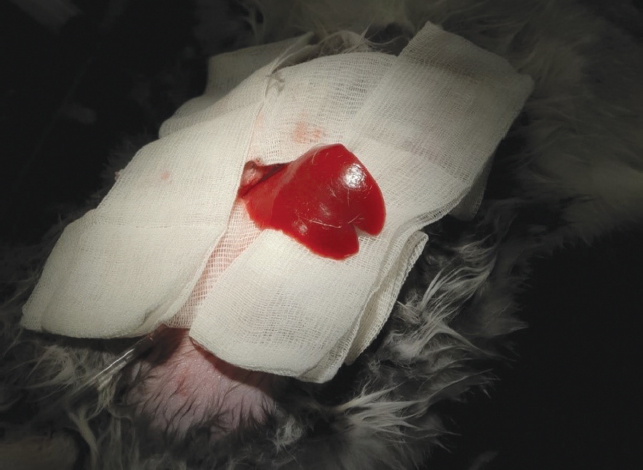 Моделирование продолжающегося внутрибрюшного кровотечения состояло из нескольких этапов. После премедикации препаратом «Золетил 100» (Вирбак, Франция) в дозировке 5 мг/кг экспериментальное животное фиксировали на операционном столе в положении лежа на спине. Дополнительно к общей анестезии выполняли местную инфильтрационную анестезию 0,25 % раствором новокаина в место оперативного доступа. Следующим этапом выполняли лапаротомию. Выводили среднюю долю печени в просвет лапаротомной раны (рис. 2).