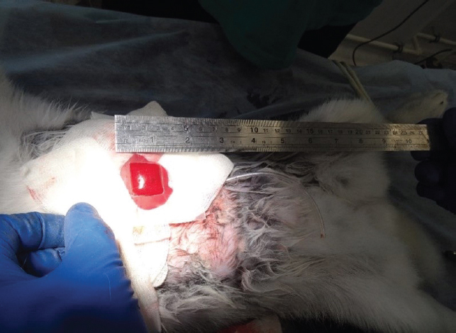 Далее при помощи специального пластикового трафарета, используя скальпель, наносили стандартизированную рану печени размерами 2 × 2 см глубиной 4 мм (рис. 3).