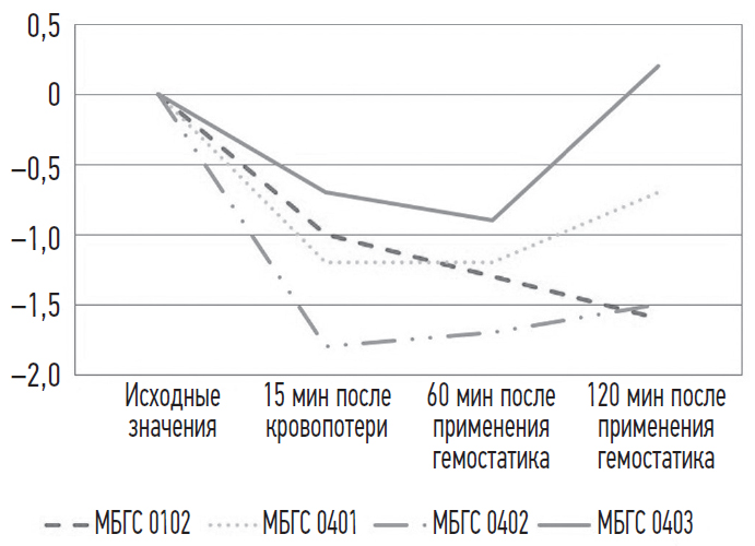 Таблица 3. Изменение интенсивности кровотечения спустя 120 мин наблюдения в зависимости от используемого образца МБГС | |||||||