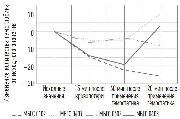 Результаты эксперимента позволяют сделать вывод о перспективности и необходимости продолжения исследования образцов МБГС. При сравнении результативности опытных образцов МБГС на модели острого массивного внутриполостного (паренхиматозного) кровотечения в результате повреждения печени у кроликов наиболее перспективными оказались препараты МБГС 0103 и 0402. Так, лабораторный образец МБГС 0103 подтвердил свою эффективность во всех экспериментах до полной остановки кровотечения. Препарат МБГС 0402 способствовал формированию менее эффективного гемостаза во всех случаях.