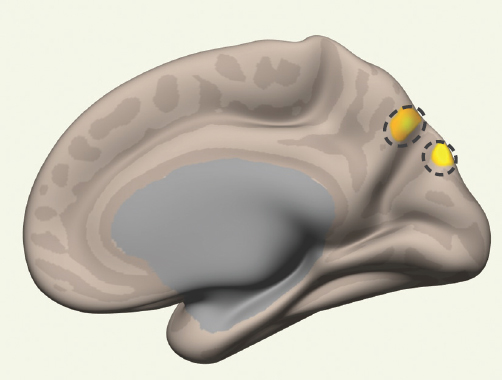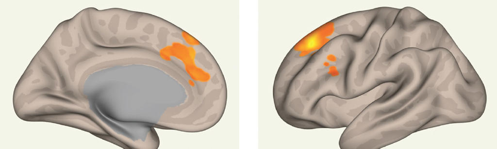 Второй кластер с SN достаточно сильно отличался от первого и был представлен обширными зонами лобной коры как с дорзальной, так и с медиальной поверхности головного мозга (рис. 4). Также отмечалось двустороннее вовлечение парацингулярной извилины.