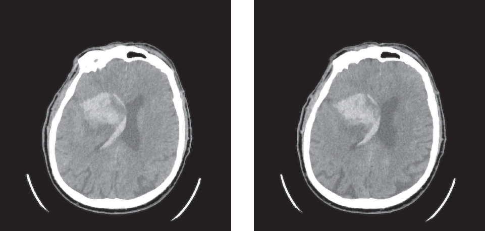 Рис. 1. Компьютерная томография головы. В базальных ядрах правого полушария визуализируется зона ишемических изменений (размерами 5,2 × 4,9 см) с наличием зоны гиперденсных (геморрагических) изменений (плотностью +60HU – кровь), занимающей более 30 % зоны ишемии, с прорывом крови в правый боковой, III, IV и левый боковой (небольшое количество в области тела и заднего рога) желудочки. Небольшое количество крови в бороздах теменной области с обеих сторон. Пациент Д., 72 года, госпитализирован в неврологический стационар ввиду внезапно развившейся слабости в левой руке и ноге. При осмотре неврологом, по результатам компьютерной томографии головы диагностировано острое нарушение мозгового кровообращения по ишемическому типу кардиоэмболического генеза в бассейне правой средней мозговой артерии (тромбоз М1 сегмента). Проведена системная тромболитическая терапия, локальная эндоваскулярная трансартериальная тромбэкстракция из сегмента М1 правой средней мозговой артерии и сегмента А2 правой передней мозговой артерии. В первые сутки после дебюта инсульта у пациента развился однократный билатеральный тонико-клонический приступ. По результатам компьютерной томографии головы — геморрагическая трансформация (паренхиматозная гематома 2-го типа — внутримозговая гематома в базальных ядрах правого полушария с прорывом крови в вентрикулярную систему, субарахноидальное кровоизлияние)