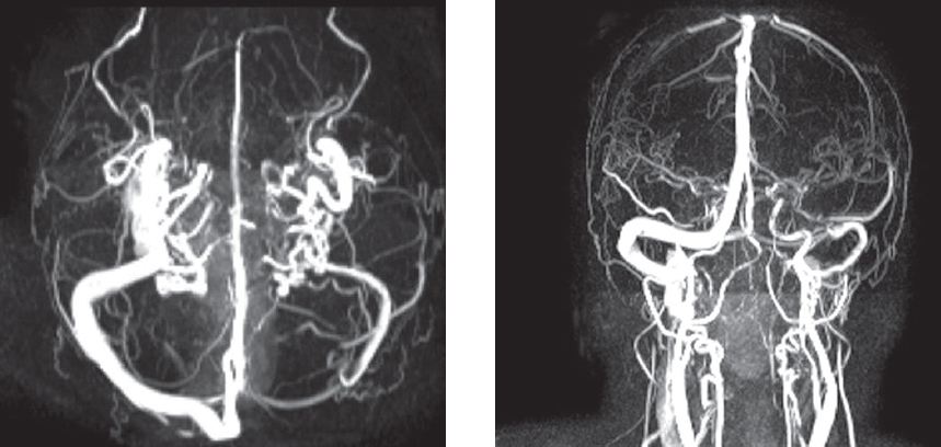 Рис. 2. Пациентка М., 51 год. Магнитно-резонансная венография головного мозга: магнитно-резонансные признаки снижения тока крови по левому поперечному синусу, нельзя исключить наличие тромботических масс. Магнитно-резонансная картина асимметрии поперечных, сигмовидных синусов и яремных вен (D > S). Анамнез заболевания. На фоне полного благополучия у пациентки развился билатеральный тонико-клонический приступ, сопровождавшийся прикусом языка, непроизвольным мочеиспусканием. Была госпитализирована в неврологический стационар, диагностирован судорожный эпилептический статус, который был купирован внутривенным введением диазепама и вальпроевой кислоты. В последующем в неврологическом статусе рассеянная неврологическая симптоматика, постприступная спутанность сознания (дезориентация во времени, месте, собственной личности, которая сохранялась в течение одного часа). Были выполнены компьютерная томография и компьютерно-томографическая ангиография головного мозга: компьютерно-томографических данных за наличие патологических образований, участков кровоизлияний, ишемии в веществе головного мозга, артериовенозных мальформаций, аневризматических расширений сосудов головного мозга не выявлено. С учетом данных анамнеза и клинической картины, повышения уровня D-димера в плазме крови до 3300 нг/мл, проводился дальнейший диагностический поиск. По результатам магнитно-резонансной венографии диагностирован тромбоз венозного синуса без формирования инфаркта головного мозга