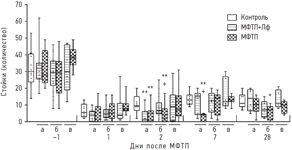 В 1-й день не было обнаружено различий между группами по количеству стоек (рисунок). На 2-й день в группах МФТП1 (3,3 ± 1,8), МФТП2 (4,4 ± 1,5) и МФТП+Лф1 (2,9 ± 1,4) количество стоек в ОП было меньше, чем в контроле (10,4 ± 1,6) (p < 0,01). На 7-й день в группе МФТП+Лф1 (12,2 ± 2,9) наблюдали увеличение этого показателя до уровня контроля (13,6 ± 1,2), чего не произошло в группе МФТП1 (2,6 ± 1,1; p < 0,01 по сравнению с контрольной группой; p < 0,05 по сравнению с группой МФТП+Лф1). На 28-й день только группа МФТП2 (7,5 ± 2,0; p < 0,05) отличалась от контроля (12,7 ± 1,4). Группы МФТП3 и МФТП+Лф3 (введение Лф/PBS через 24 ч после МФТП) не отличались от контроля по этому параметру на протяжении всего эксперимента.