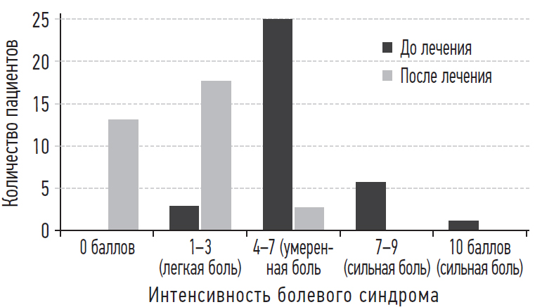 Оценка интенсивности хронического болевого синдрома при применении ВАШ показала преобладание цефалгии умеренной выраженности. После проведения комплексного лечения наблюдалась значимая (p < 0,05) динамика снижения болевого синдрома (рисунок).