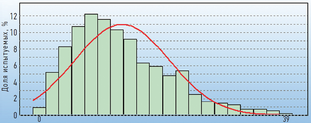 Для определения нормальности распределения использовался статистический критерий Колмогорова–Смирнова. Расчет показал, что вероятность того, что распределение показателей по шкалам имеет нормальное распределение, практически равна нулю. Однако следует учесть, что коэффициенты As и эксцесса по модулю не превышают критического значения 2.