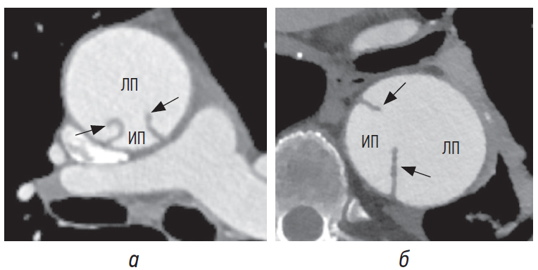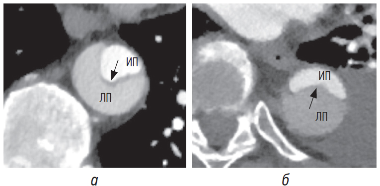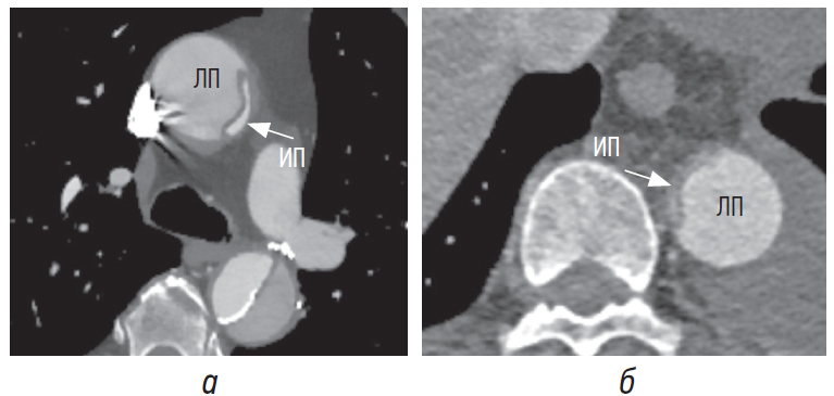 Рис. 9. Свободные края интимомедиального лоскута (стрелки) направлены в сторону ложного просвета в восходящем отделе (а), в нисходящем отделе (б). ИП — истинный просвет, ЛП — ложный просвет