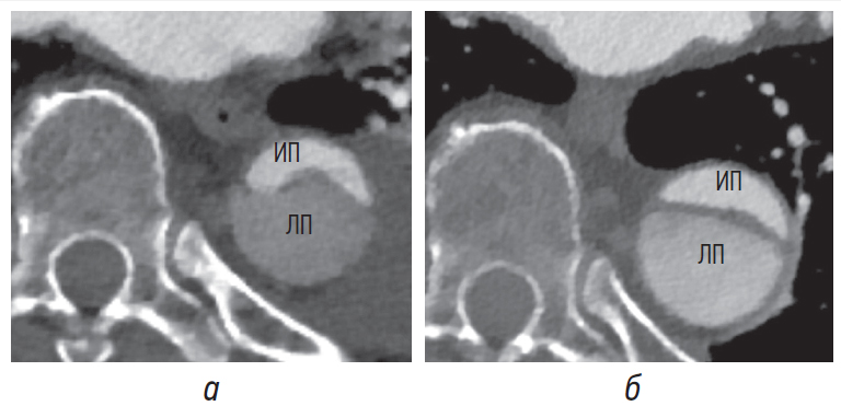 Рис. 2. Ложный просвет больше истинного просвета при острой диссекции (а) и при контроле через 1 год (б). ИП — истинный просвет, ЛП — ложный просвет