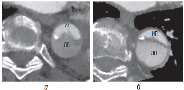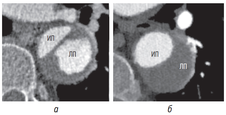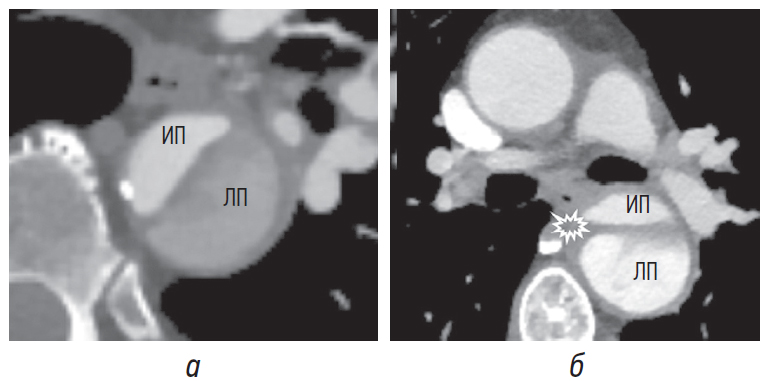 Рис. 3. Отношение размеров истинного и ложного просветов в острый период (а), в хронический период через 1 год (б). ИП — истинный просвет, ЛП — ложный просвет