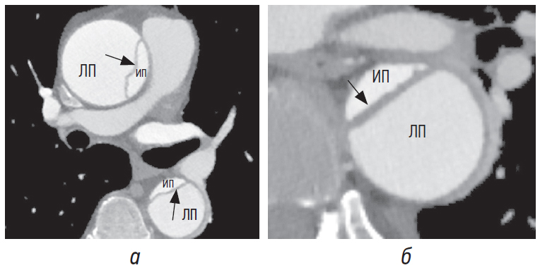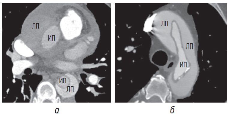 Рис. 15. При острой диссекции истинный просвет располагается во внутренней части аорты, а ложный просвет во внешней части аорты с тромбозом ложного просвета в восходящем отделе (а). На уровне дуги аорты истинный просвет занимает центральное положение (б). ИП — истинный просвет, ЛП — ложный просвет