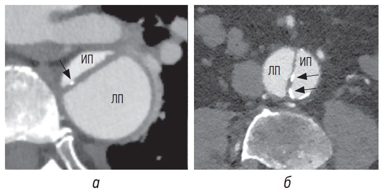 Еще одним важным признаком, позволяющим дифференцировать истинный и ложный просветы, является кальциноз стенки аорты в области диссекции. При острой диссекции кальциноз стенки аорты всегда указывает на истинный просвет (рис. 11, а) и никогда не определяется в ложном просвете. Однако при хронической диссекции этот признак не настолько надежен, потому что стенка ложного просвета хотя и намного реже, но также может быть обызвествлена (рис. 11, б). При этом кальциноз стенки ложного просвета наблюдается только при хронических диссекциях, что связано с ее эндотелизацией и последующей кальцификацией. Также отсутствие кальциноза внешней стенки со стороны эксцентрично расположенного тромба помогает отличить тотально тромбированный ложный просвет при аортальной диссекции от пристеночного тромба аневризмы аорты [4, 5, 7, 8].