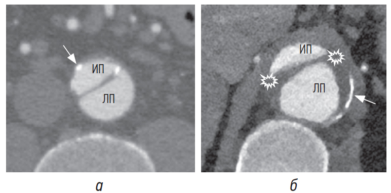 Рис. 11. Кальциноз стенки (стрелка) истинного просвета при острой диссекции (а). Со стороны стенки ложного просвета обызвествлений не наблюдается, поскольку имеющийся кальцинат отслоен совместно с лоскутом интимы и обращен в сторону истинного просвета. При хронической диссекции (б) по стенке ложного просвета отмечаются неравномерной толщины пристеночные тромботические массы (фигуры) с наличием линейной формы обызвествления (стрелка). ИП — истинный просвет, ЛП — ложный просвет
