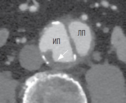 Рис. 10. Интимомедиальный лоскут при хронической диссекции утолщен и уплощен с наличием отчетливо визуализируемых на его фоне кальцинатов (стрелки) со стороны истинного просвета. Со стороны ложного просвета стенка лоскута имеет мягкотканную плотность. ИП — истинный просвет, ЛП — ложный просвет