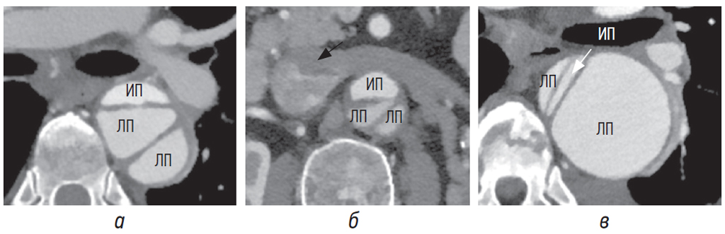 Рис. 4. Признак «клюва» в восходящем отделе аорты (а), в нисходящем отделе аорты (б) (белые стрелки) без признаков тромбоза. Интимомедиальный лоскут отмечен черными стрелками. ИП — истинный просвет, ЛП — ложный просвет ЛП