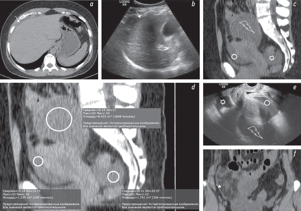 Рис. 1. На нативной КТ-томограмме в аксиальной плоскости (а) и на трансабдоминальной сонограмме (b) визуализируется свободная жидкость около печени (стрелка). На нативных КТ-томограммах в сагиттальной (c, d) плоскости и на трансвагинальной сонограмме (e) показана кровь в виде свободной жидкости в маточно-пузырном пространстве (круг) и в маточно-прямокишечном пространстве (звездочка). Эндометриоидная киста (молния) визуализируется на КТ-томограммах (c, d), трасвагинальной сонограмме (e). На КТ-томограмме (d) показаны коэффициенты ослабления рентгеновского излучения в единицах Хаунсфилда в эндометриоидной кисте и в свободной жидкости в полости малого таза. Инфильтрация большого сальника справа (пунктирная стрелка) на КТ-томограмме во фронтальной плоскости (f)
