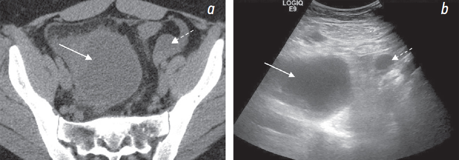 Рис. 2. На нативной КТ-томограмме в аксиальной плоскости (а) и на трансабдоминальной сонограмме (b) показаны правый яичник с эндометриоидной кистой (стрелка) и левый яичник, содержащий фолликул (пунктирная стрелка)