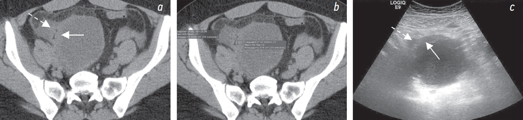 Рис. 3. На нативных КТ-томограммах в аксиальной плоскости (а, b) в месте наибольшего утолщения стенок кисты (стрелка) с наружной стороны прилежат сгустки (пунктирная стрелка). Аналогичная трансабдоминальная сонограмма (c)