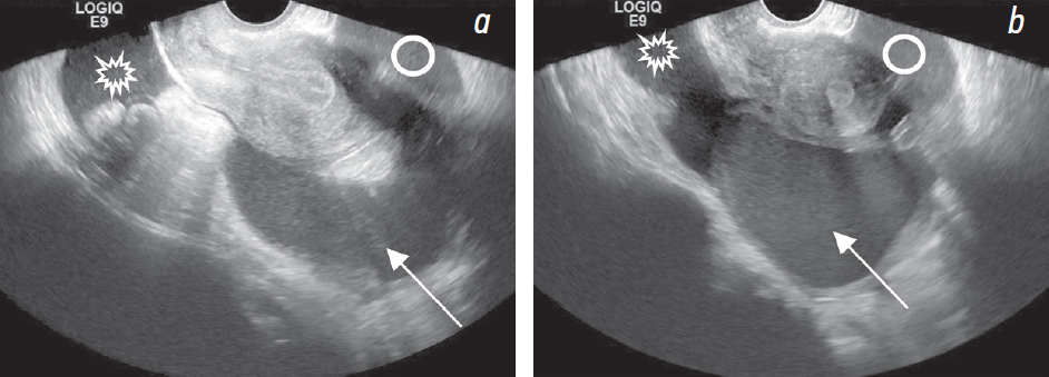 Рис. 4. На трансвагинальных сонограммах (а, b) показан идентичный сонографический паттерн жидкости в эндометриоидной кисте (стрелка) и свободной жидкости в маточно-пузырном пространстве (круг) и в маточно-прямокишечном пространстве (звездочка)