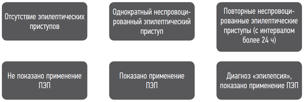 - при повторных неспровоцированных эпилептических приступах (с интервалом более 24 ч) — обоснован диагноз «эпилепсия» и необходимо назначение ПЭП;