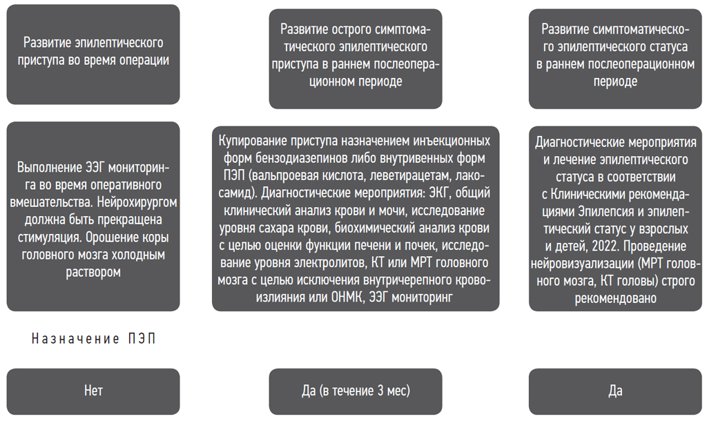 Алгоритмы применения ПЭП в нейроонкологической практике имеют особенности при развитии острых симптоматических эпилептических приступов во время операции, острого симптоматического эпилептического приступа в раннем послеоперационном периоде, а также эпилептического статуса в раннем послеоперационном периоде.
