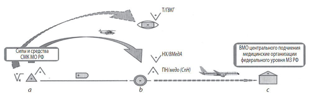 Рисунок. Организация лечебно-эвакуационных мероприятий в районе стихийных бедствий, катастроф в ходе проведения гуманитарных операций с использованием медицинских групп и бригад специализированной медицинской помощи Минобороны России. a — Первая помощь (доврачебная и первая врачебная помощь; первичная медико-санитарная помощь (323 ФЗ)); b — квалифицированная и отдельные виды специализированной медицинской помощи (первичная медико-санитарная помощь, скорая, в т. ч. скорая специализированная медицинская помощь (323 ФЗ)); с — специализированная медицинская помощь (специализированная, в том числе высокотехнологичная, медицинская помощь)