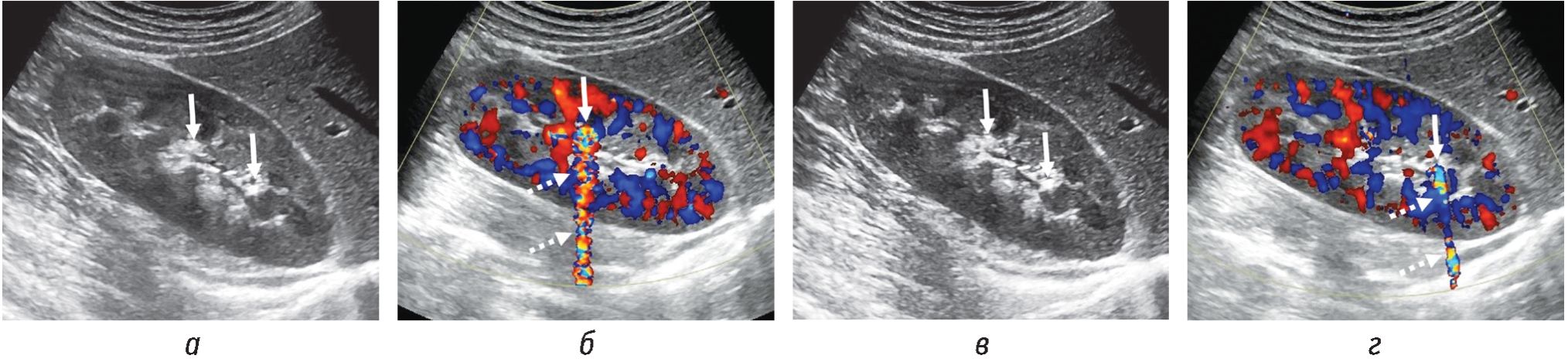 Рис. 1. Трансабдоминальные сонограммы (а, в): два конкремента (сплошные стрелки) размерами 3 и 4 мм в нерасширенных чашечках без четкой акустической тени. АМ каждого из конкрементов указан пунктирными стрелками на соответствующих изображениях в режиме ЦДК справа (б, г)