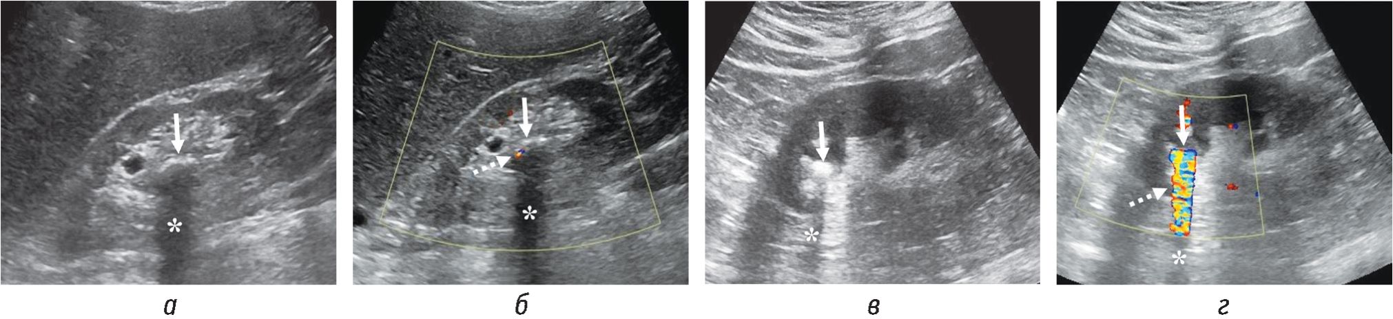 Рис. 2. Трансабдоминальные сонограммы (а–г) двух пациентов: а — конкремент одного пациента размером 12 мм в нерасширенной лоханке с акустической тенью; в — конкремент другого пациента размером 8 мм в расширенной чашечке с акустической тенью. Конкременты указаны сплошными стрелками, акустическая тень — звездочкой. Соответствующие сонограммы в режиме ЦДК представлены на изображениях б и г. АМ каждого из конкрементов указан пунктирными стрелками