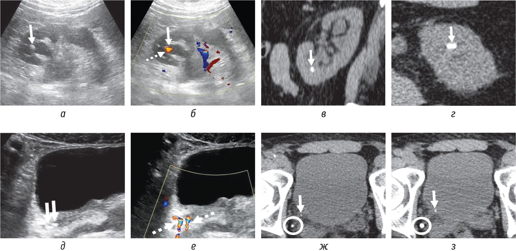 Рис. 3. Трансабдоминальные сонограммы (а, б) и бесконтрастные КТ-снимки (в, г) пациентки 49 лет: а — конкремент (сплошная стрелка) 6 мм в расширенной чашечке без четкой АТ; б — соответствующая сонограмма в режиме ЦДК, АМ указан пунктирной стрелкой; в и г — тот же конкремент, визуализируемый на снимках по длинной (в) и короткой (г) осям почки соответственно. Трансабдоминальные сонограммы (д, е) и бесконтрастные КТ-снимки (ж, з) пациента 60 лет: д — два конкремента (сплошные стрелки) 3 и 4 мм, без акустической тени, в юкставезикальном отделе правого мочеточника; е — соответствующая сонограмма в режиме ЦДК; АМ указаны пунктирными стрелками; ж и з — снимки бесконтрастной КТ в аксиальной плоскости, проведенной через 15 мин после УЗИ, — один конкремент по-прежнему в юкставезикальном отделе правого мочеточника (ж), а второй сместился в интрамуральный отдел правого мочеточника (з). Белым кругом обведен флеболит