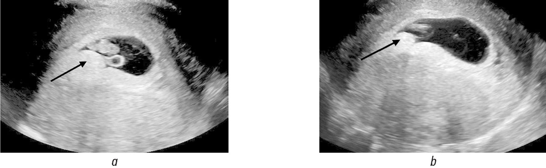 Рис. 1. На трансвагинальных сонограммах (а, b) визуализируется солитарное хориальное выпячивание (стрелки) солидной эхоструктуры, однородно повышенной эхогенности, сопоставимое по эхогенности с хорионом