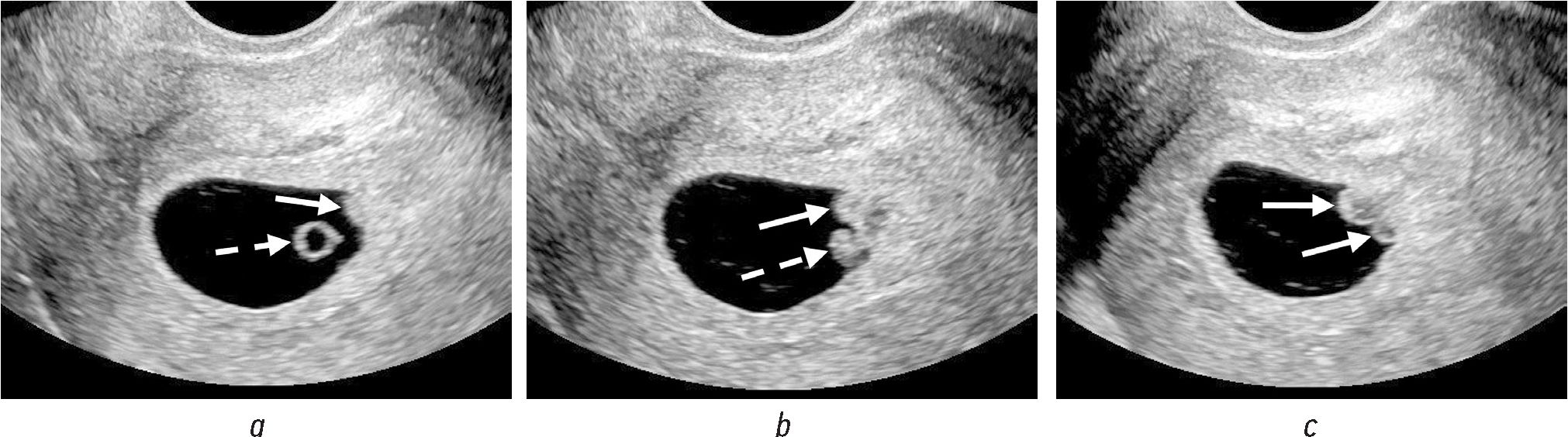 Рис. 2. На последовательных трансвагинальных сонограммах визуализируются желточный мешок (а, пунктирная стрелка), эмбрион (b, пунктирная стрелка), два ХВ частично (a и b, сплошные стрелки) и полностью (c, сплошные стрелки), гипоэхогенные в центральной части с периферическим гиперэхогенным ободком