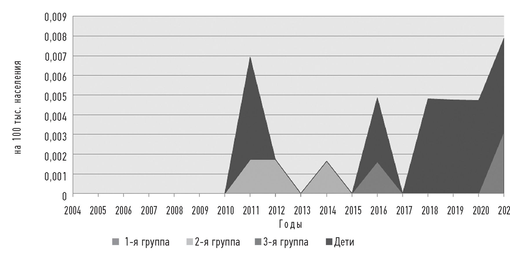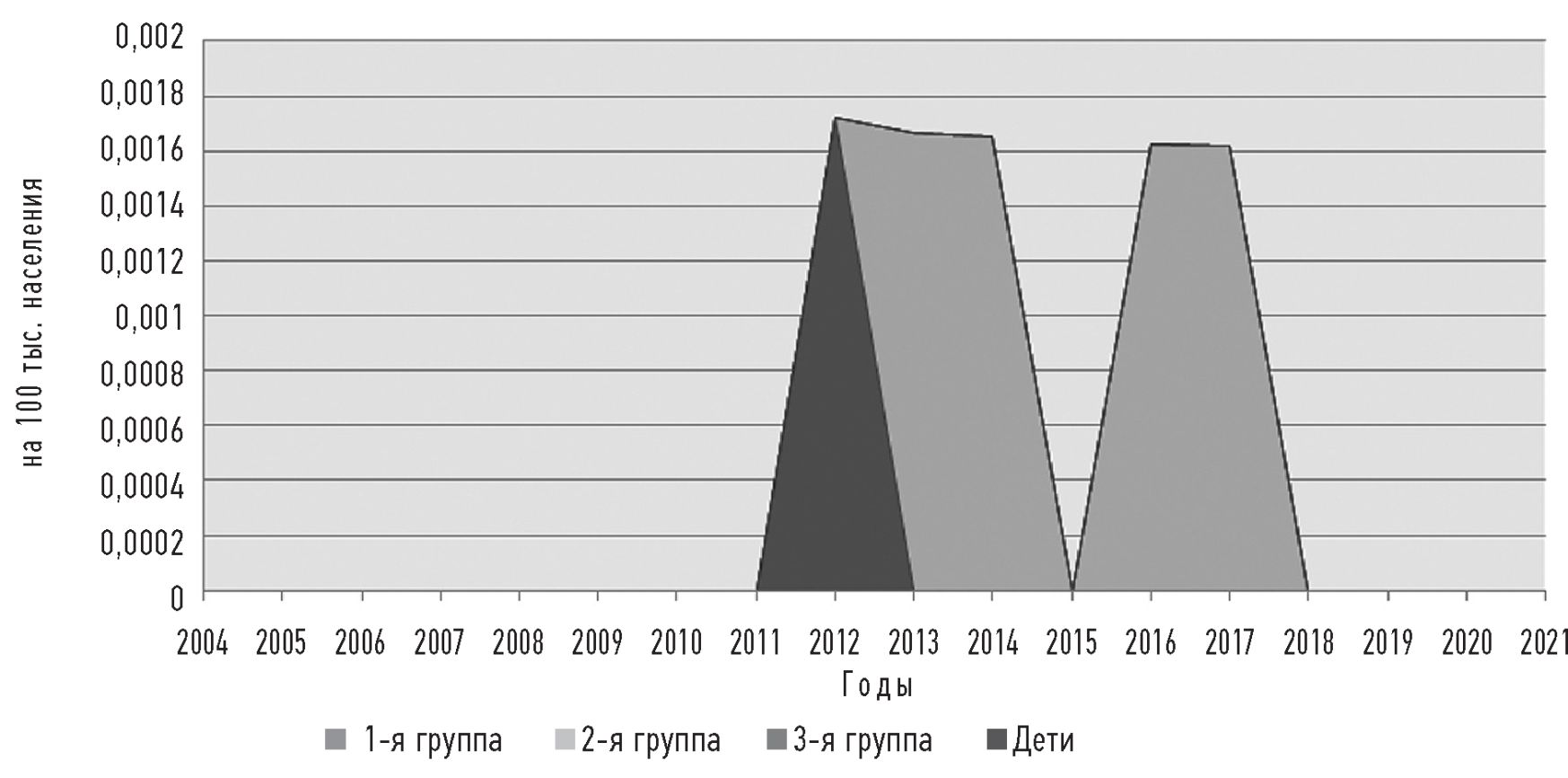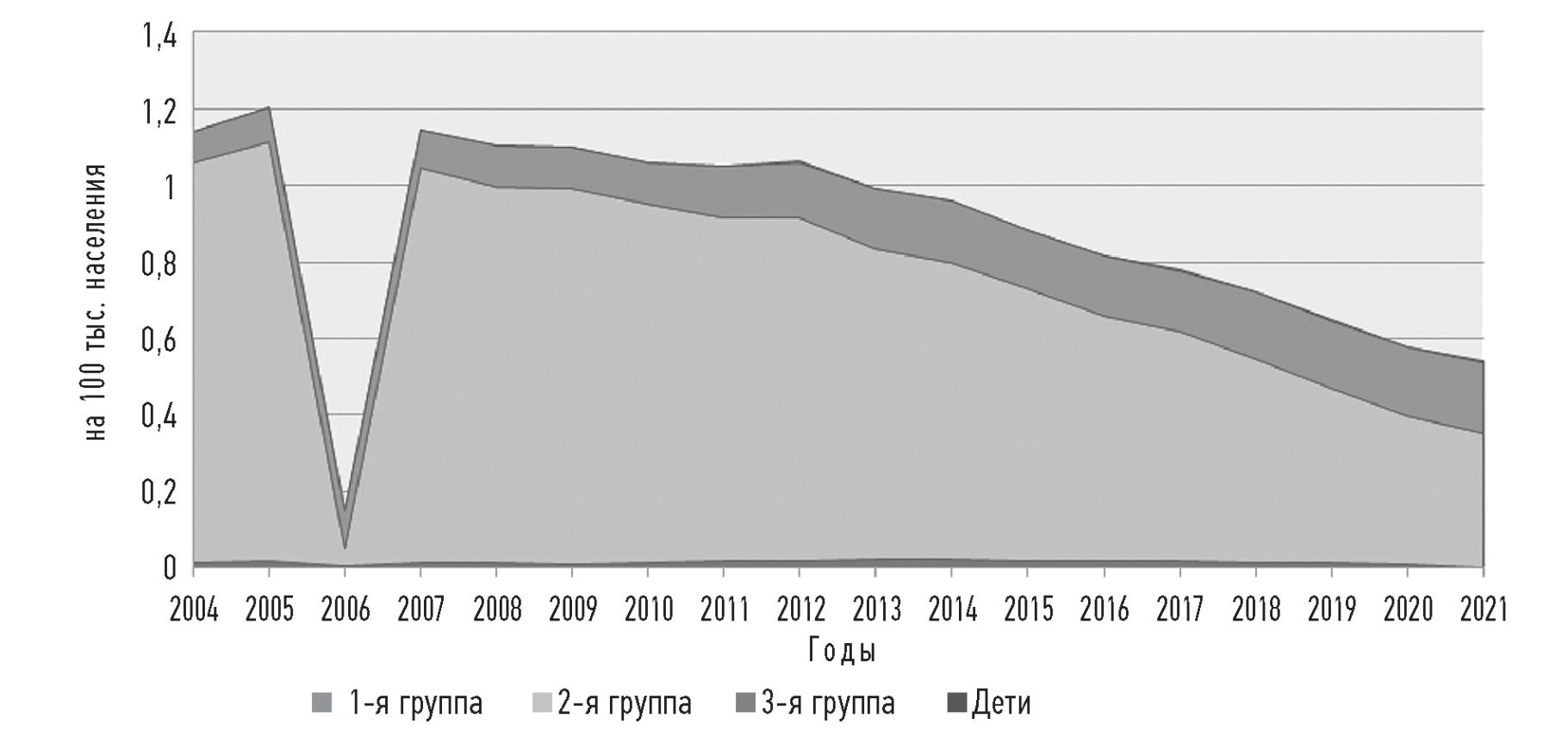 The prevalence of the newly diagnosed disabilities showed similar trends from 2004 to 2021 (per 100 thousand population), with an unstable increase from 0.006 to 0.01 in group 1 (r = 0.05), sustainable growth from 0.09 to 0.55 in group 3 (r = 0.81) and from 0.47 to 0.57 pediatric group (r = 0.67), and a steady decrease from 0.76 to 0.16 in group 2 (r = –0.79).