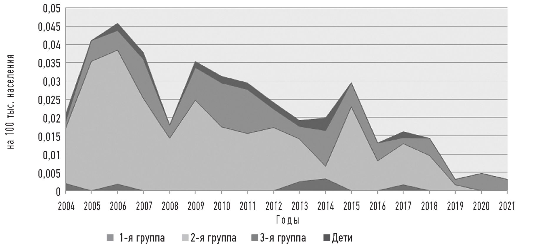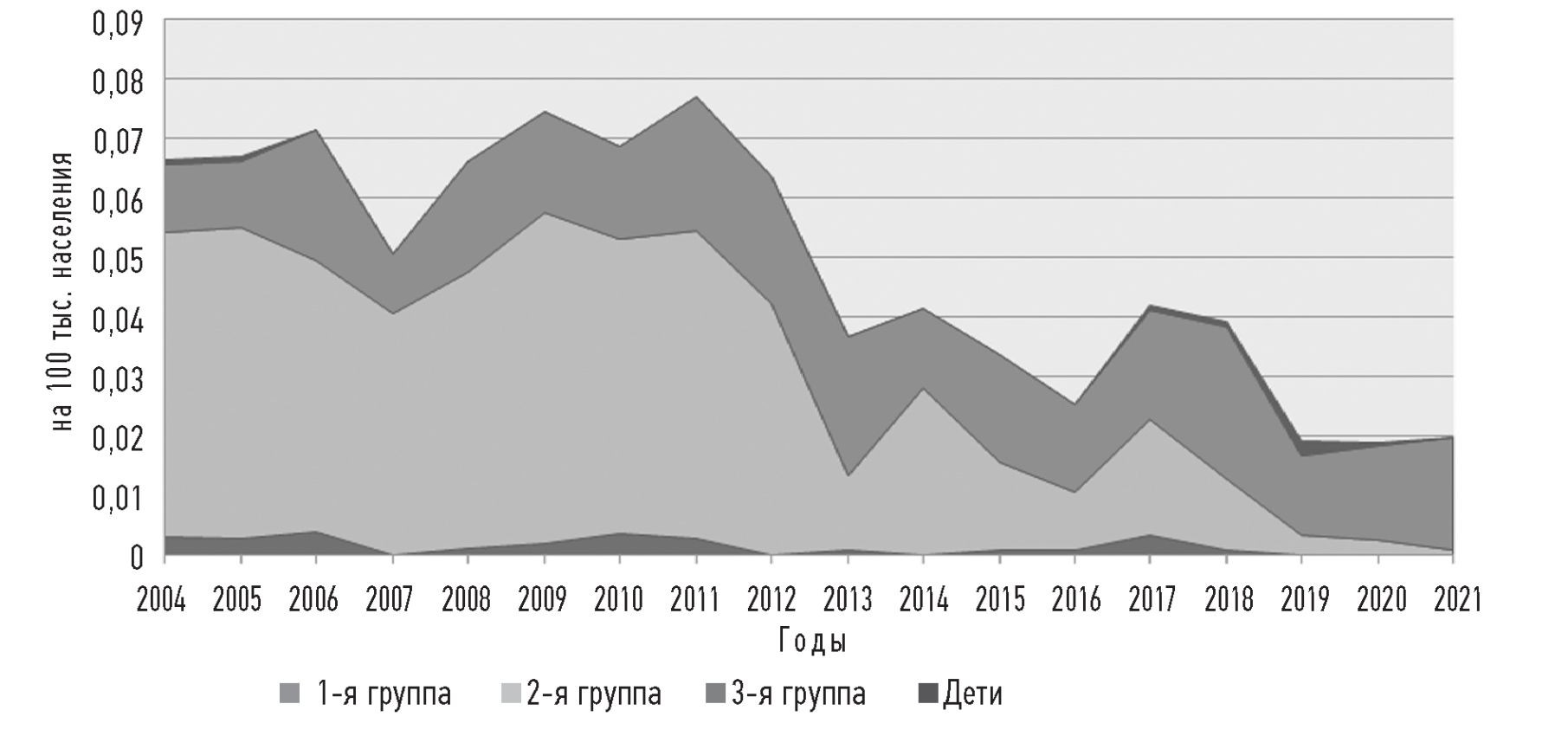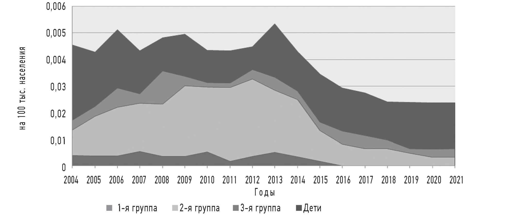 The prevalence of the newly diagnosed disabilities showed similar trends from 2004 to 2021 (per 100 thousand population), with an unstable increase from 0.006 to 0.01 in group 1 (r = 0.05), sustainable growth from 0.09 to 0.55 in group 3 (r = 0.81) and from 0.47 to 0.57 pediatric group (r = 0.67), and a steady decrease from 0.76 to 0.16 in group 2 (r = –0.79).