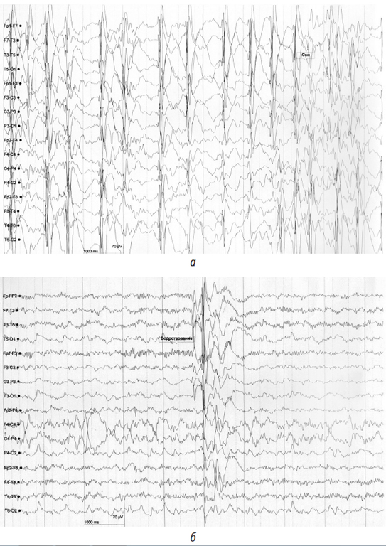 Рис. 3. Электроэнцефалограмма пациентки: а — комплексы острая волна – медленная волна с преобладанием в лобно-височных областях обоих полушарий во время бодрствования; б — регулярная диффузная эпилептиформная активность высокоамплитудные комплексы острая волна – медленная во время сна