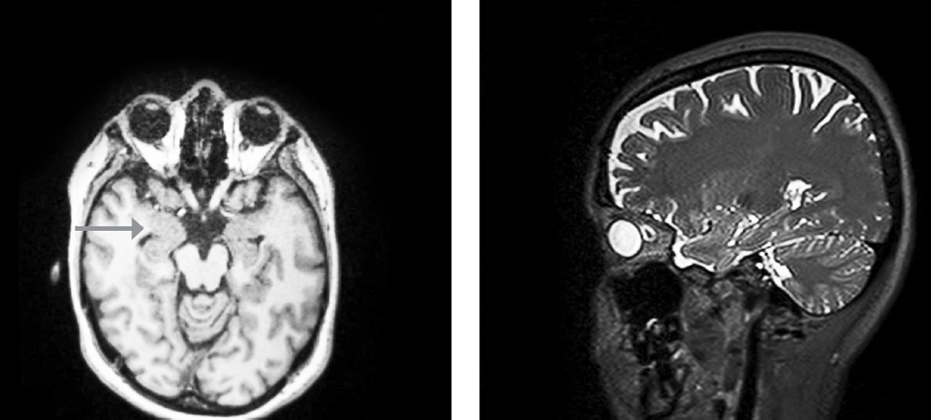 Рис. 1. Участок структурных изменений в кортикальных-субкортикальных медиобазальных отделах правой височной доли — более вероятна DNET. Единичный очаг глиоза в левой височной доле, вероятно, неспецифического резидуального генеза, не выраженного расширения наружного ликворного пространства. В сравнении с МРТ от 2009 г. — без динамики по размерам изменения в правой височной доле