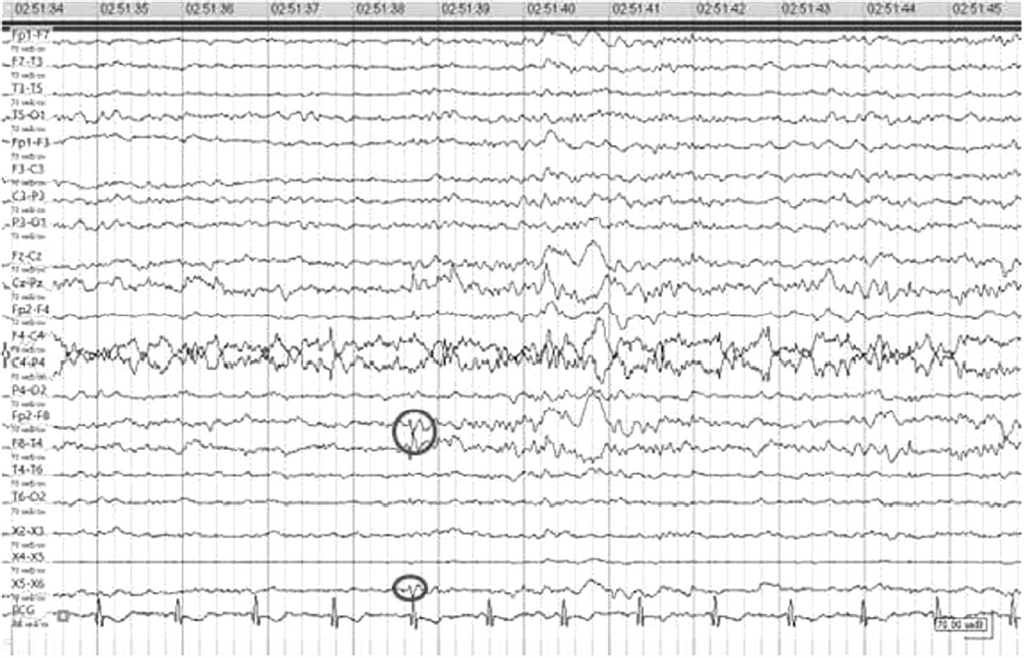 В июле 2021 г. был выполнен видео-ЭЭГ-мониторинг, где в I–II стадии сна обнаружена итнериктальная активность в правых заднелобно-височных отведениях (в структуре периодического замедления вспышки колебаний, схожие с комплексами острая – медленная волна).