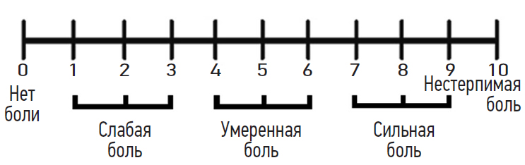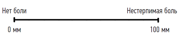 На территории Российской Федерации наибольшее распространение в рутинной клинической практике получили одномерные шкалы оценки выраженности болевого синдрома: визуально-аналоговая шкала (ВАШ; Visual Analogue Scale, 1974 г.) и цифровая рейтинговая шкала (ЦРШ; Numeric Rating Scale, NRS-11) [1, 2]. Другие шкалы оценки интенсивности боли: модифицированная лицевая шкала боли (The Faces Pain Scale-Revised, FPS-R), цветовая шкала оценки боли, 5-балльная вербальная шкала оценки боли (Frank A.J.М., Moll J.М.H., Hort J.F., 1982), вербальная описательная шкала оценки боли (Verbal Descriptor Scale, Gaston-Johansson F., Albert М., Fagan E. et al., 1990) и др. имеют меньшую распространенность [3–5]. Сложившейся клинической практикой врачей различных специальностей в Российской Федерации является синонимическое восприятие ВАШ (представляет собой 10-см линию, интенсивность боли оценивается от 0 до 100 мм; рис. 1) и ЦРШ (одномерная 11-балльная шкала от 0 до 10 баллов; рис. 2), а также оценка результатов тестирования по ним как тождественных.